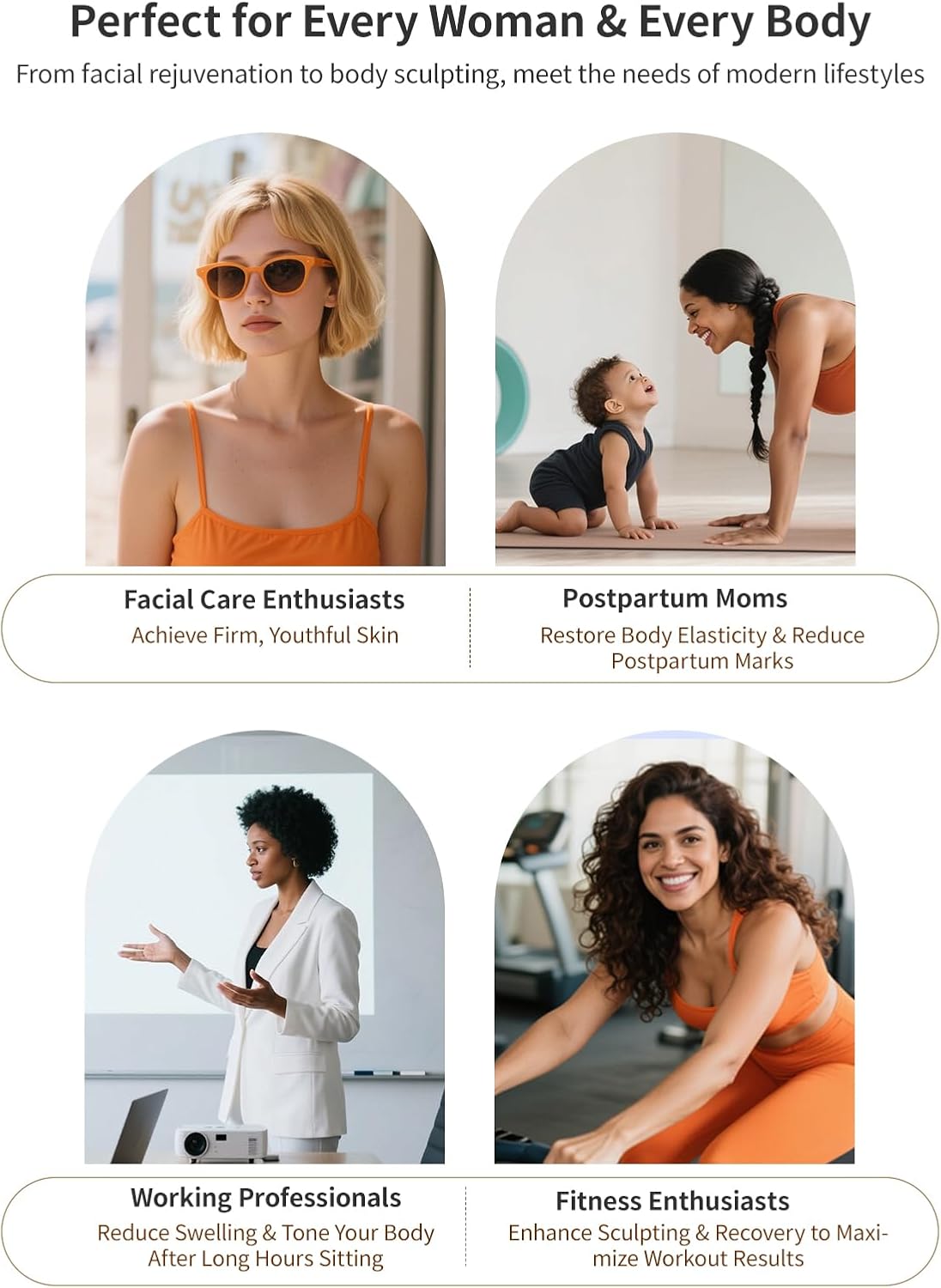 Dual Care for Face & Body:Facial mode uses SoothingPulse and LED light to lift skin, reduce fine lines, and enhance elasticity. Body mode combines suction, microcurrent and light – targeting belly, thighs, arms, and waist. Perfect as a body sculpting massager for both home beauty routines and professional spa treatments.
