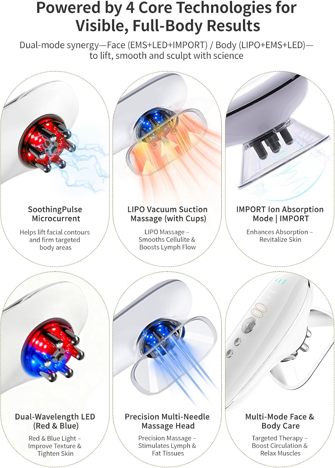 5-in-1 Multifunctional Body Sculpting Machine:Our all-in-one body contouring machine combines SoothingPulse microcurrent, IMPORT essence infusion, LIPO suction massage, and red & blue LED light . This lymphatic drainage massager lifts, firms, and sculpts both face and body for visible anti-aging and slimming results.